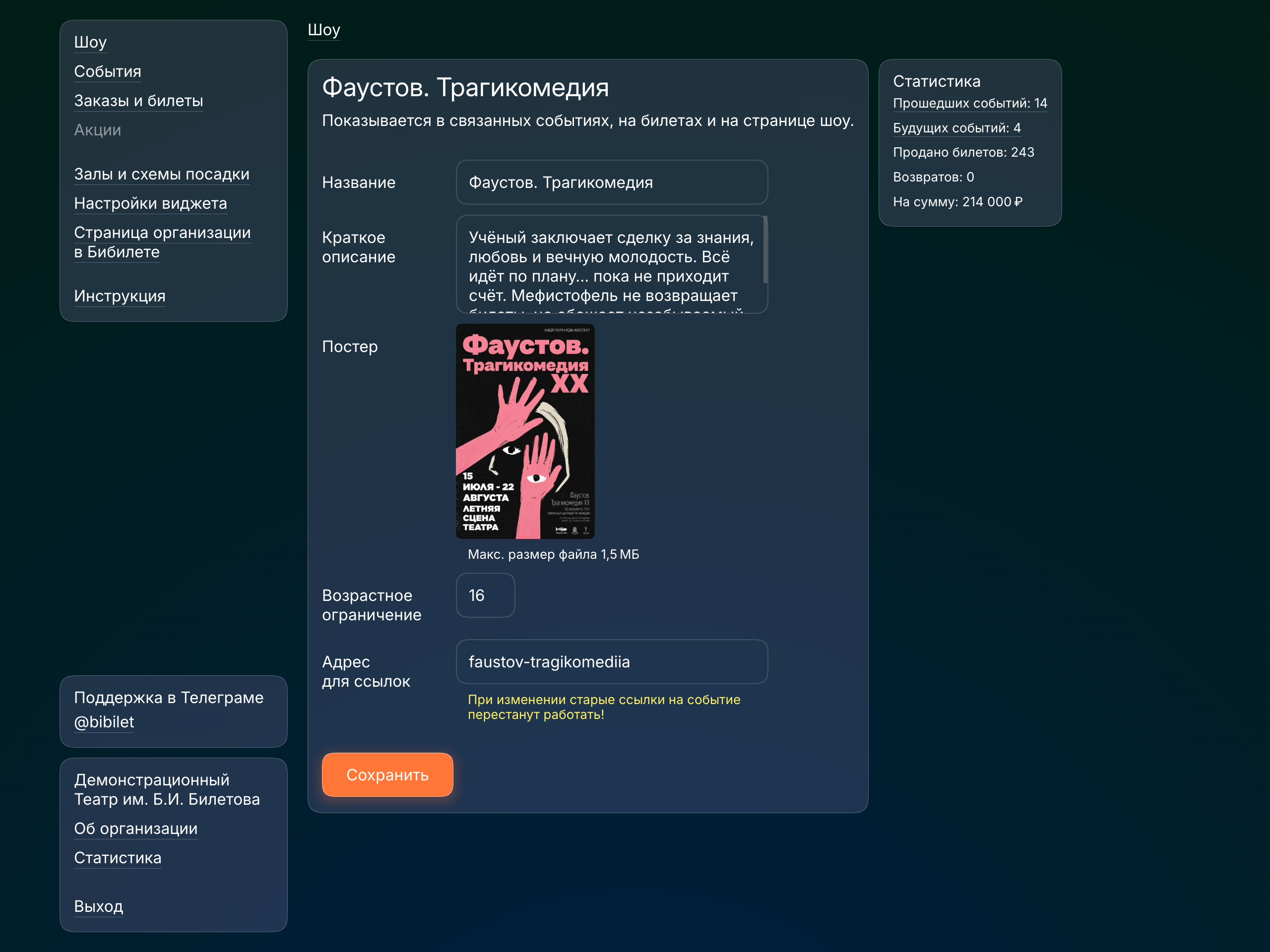 Клиенты Бибилета могут бесплатно получить сайт-афишу со своим адресом и оформлением по вашему вкусу. Этот сайт можно использовать для информирования вашей аудитории и для продажи билетов в дополнение к существующим каналам продаж.