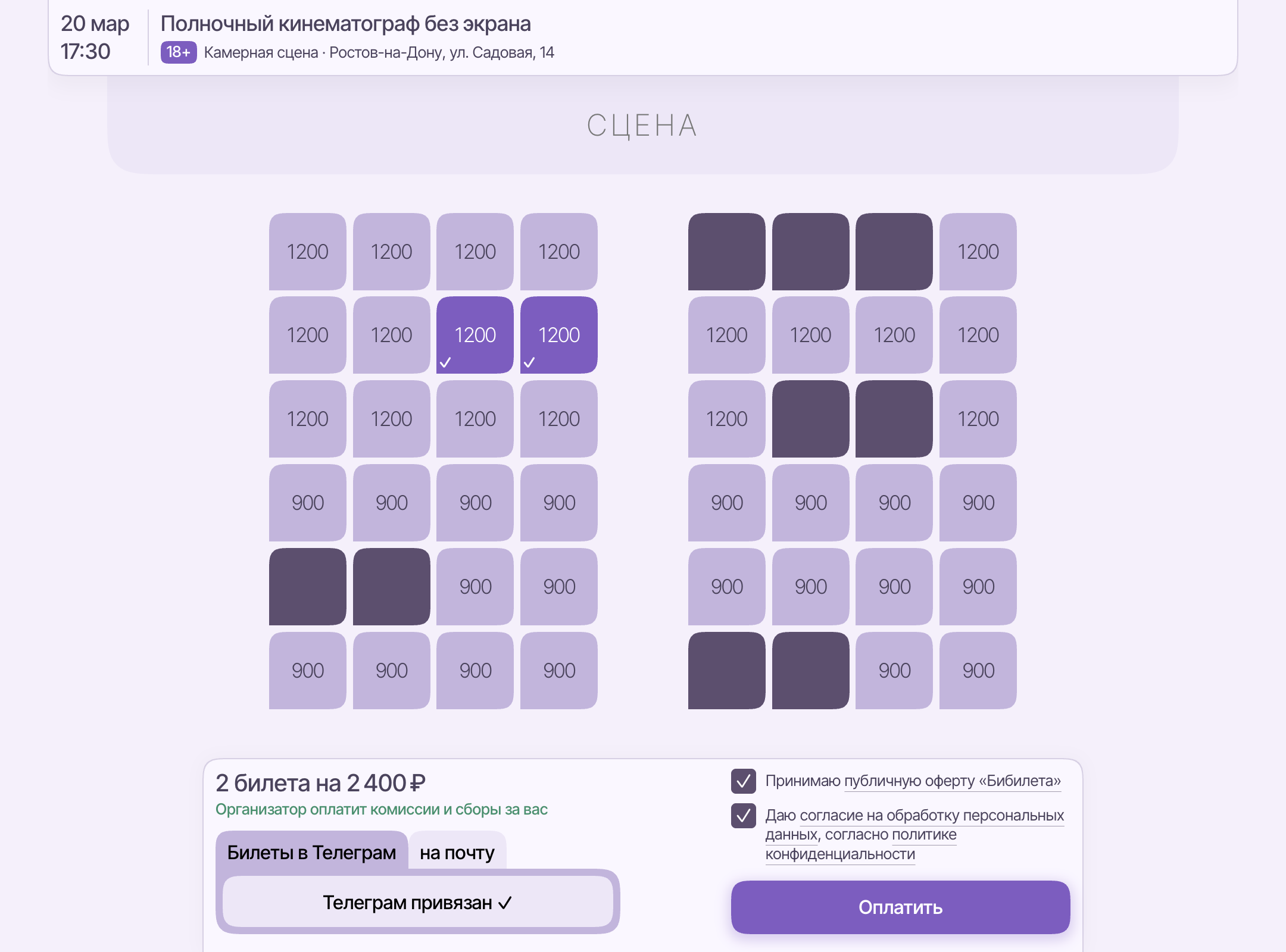 Окно покупки билетов быстро загружается и аккуратно выглядит на всех экранах. Никакой рекламы и пёстрых логотипов, можно настроить любые цвета.