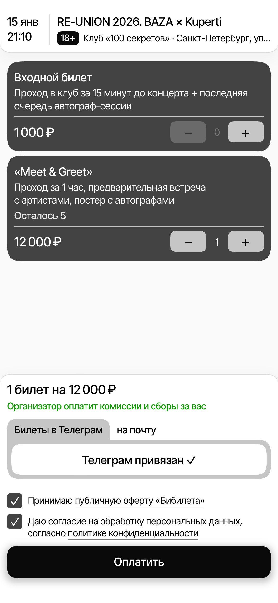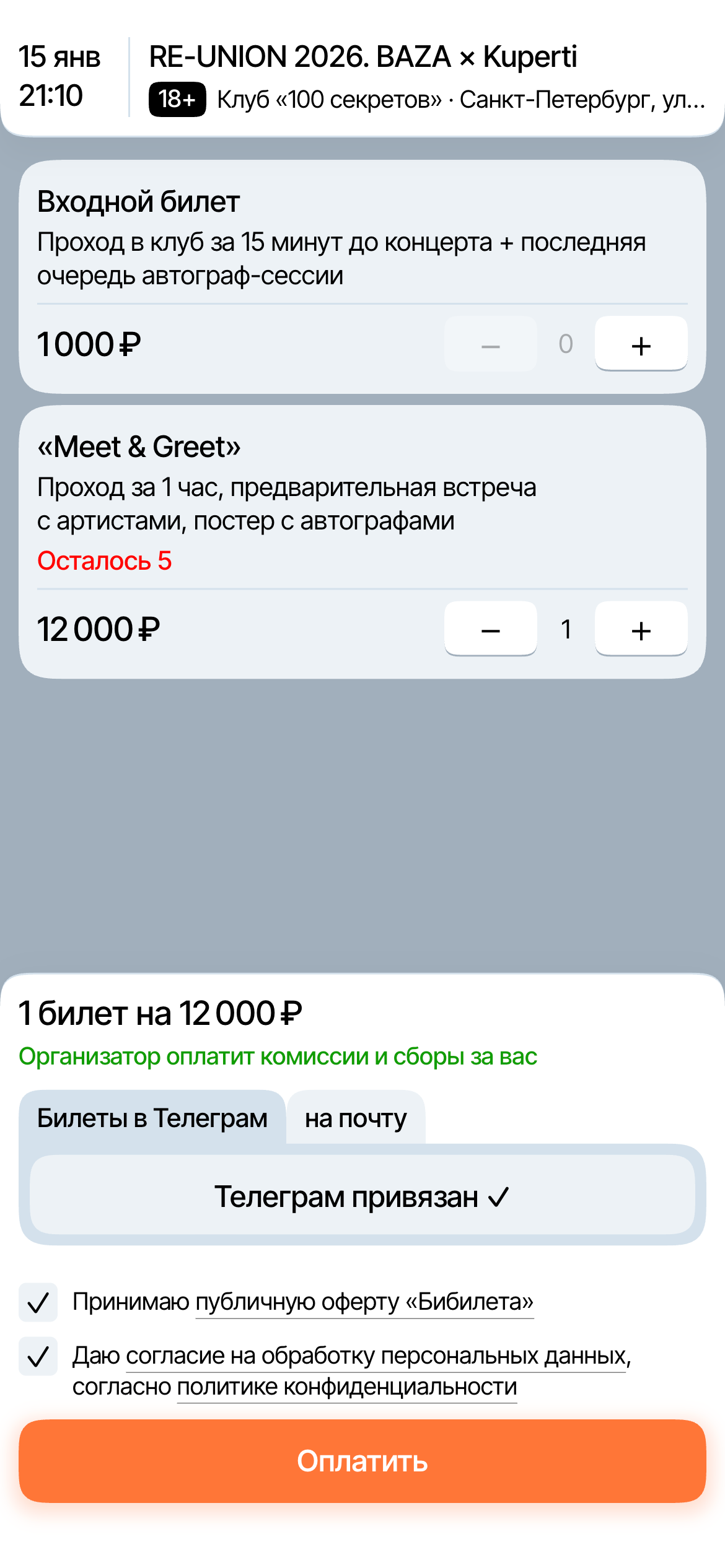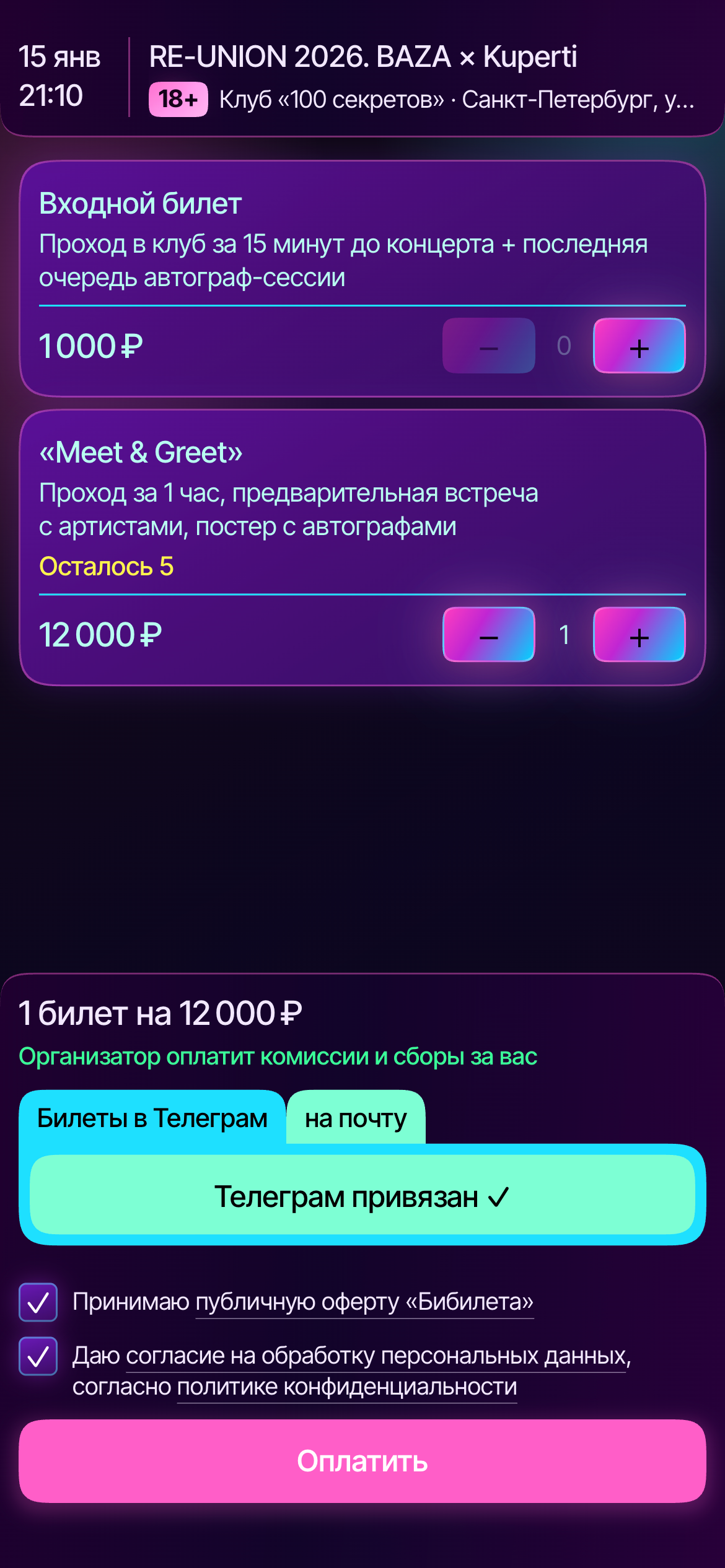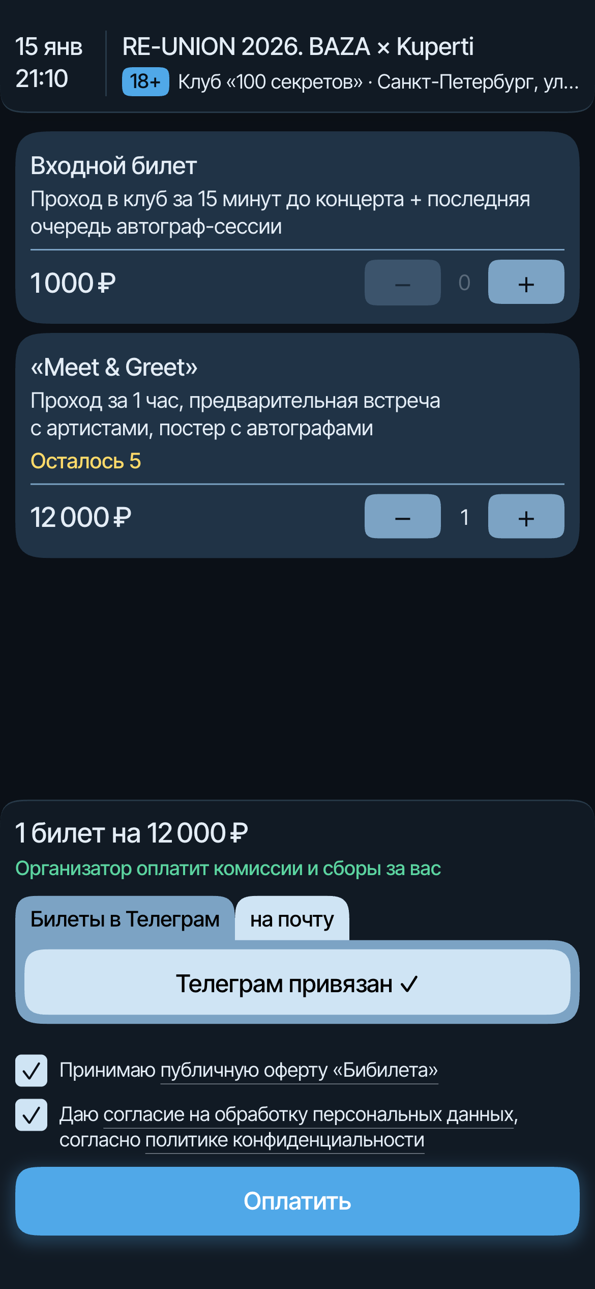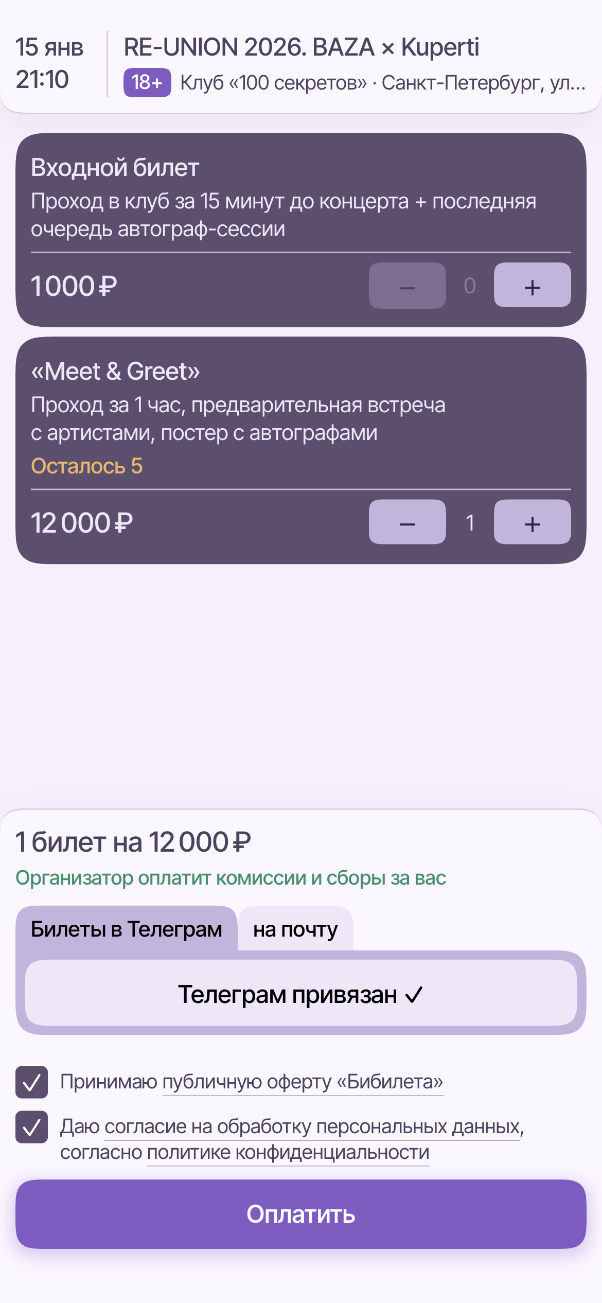 Покупатель может вернуть билет через поддержку Бибилета не позднее 24 часов до начала события. Сервисный сбор не возвращается.