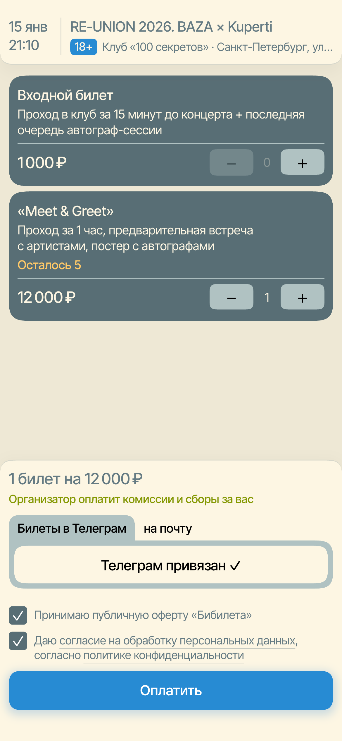 Бибилет выгоднее большинства конкурентов. У нас прозрачная оплаты работы и единая комиссия на все события.